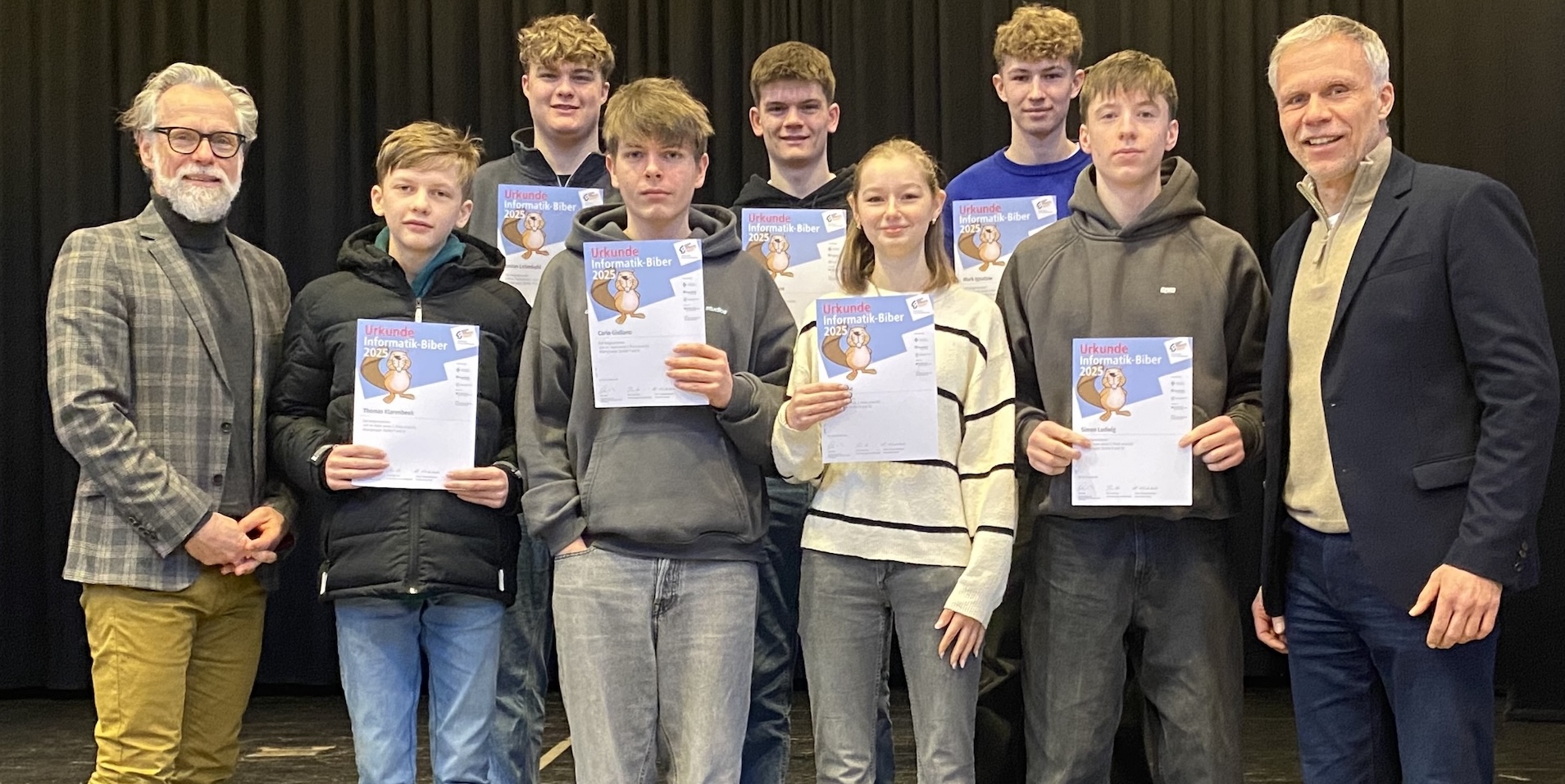 Der Schulleiter Olaf Reitenbach und sein Stellvertreter Matthias Nolte konnten nun acht Schüler:innen eine Auszeichnung für ihre sehr erfolgreiche Teilnahme überreichen. Zu den ausgezeichneten Schüler:innen gehören Thomas Klarenbeek, Carlo Giuliano, Ida Rauße, Simon Ludwih, Justus Lehmkuhl, Felix Huesmann, Mark Ignatow und Maria Veltel.