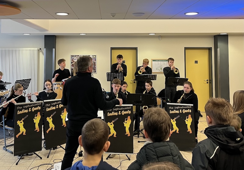 Eröffnet wurde der Vormittag mit einer stimmungsvollen musikalischen Darbietung der schuleigenen Big Band im Foyer. Dort hatte die Elternpflegschaft ein einladendes Café vorbereitet, das zum Verweilen und Informationsaustausch einlud. Um 10 Uhr begaben sich die zahlreichen Gäste gut gelaunt in die Aula, wo Schüler:innen der fünften Klassen mit einem Willkommenslied auf den Tag einstimmten. Die gesamte Veranstaltung war von der Schulgemeinschaft organisiert und durchgeführt worden.
