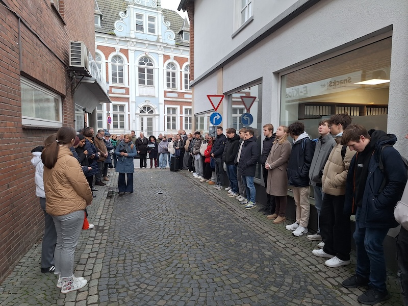 Die Führung begann um 14:00 Uhr auf dem Kirchvorplatz der Lambertikirche. Zahlreiche Schüler:innen und Interessierte, darunter auch die Bürgermeisterin Frau Lenderich und der Schulleiter Herr Reitenbach, nahmen daran teil, um mehr über das Leben und die tragischen Schicksale der jüdischen Familien van Bingen, Gottschalk und Löwenberg zu erfahren.