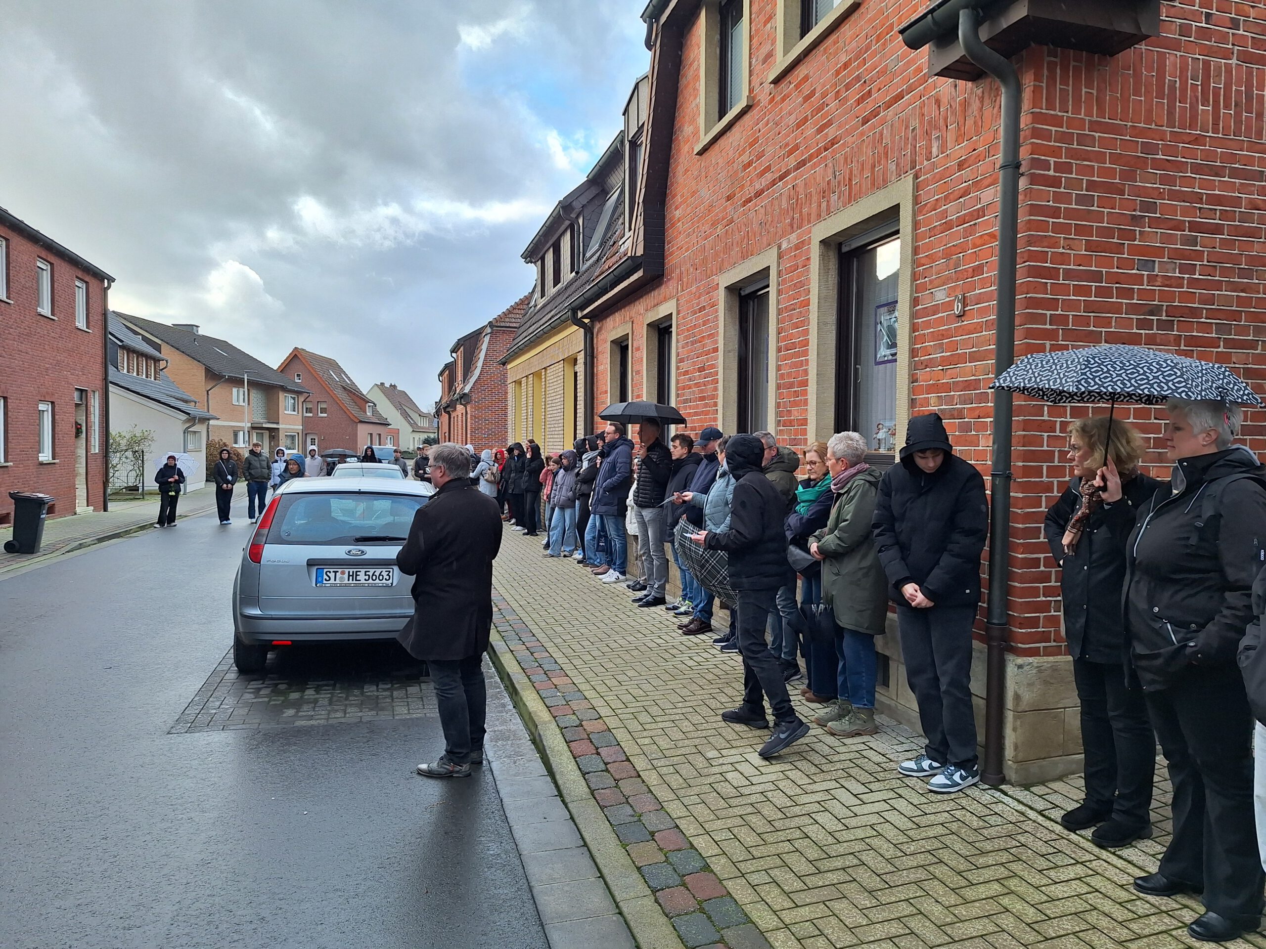 Ein besonderes Zeichen der Anteilnahme setzten die Teilnehmer:innen, indem sie weiße Rosen auf die Stolpersteine legten.