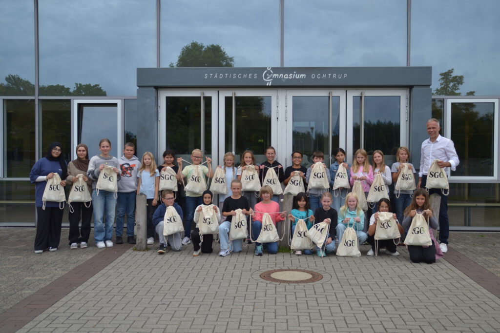 Schülervertretung (SV) einen Turnbeutel, gefüllt mit ein paar Kleinigkeiten, wie z.B. einer Trinkflasche. Die Beutel gehören gleichzeitig zu unserem offiziellen Schulmerch und sollen den neuen Schüler:innen zeigen, dass sie Teil der Schulgemeinschaft sind.