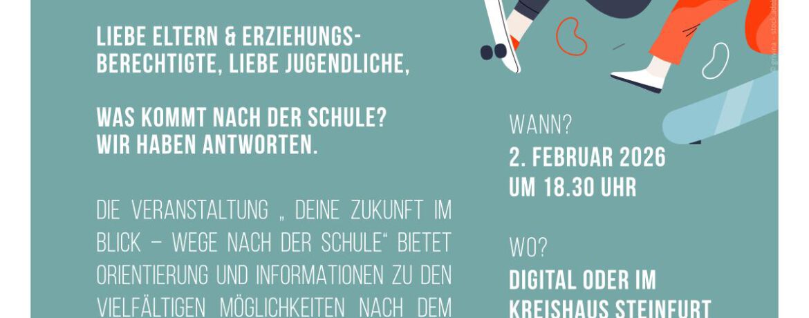 Das Bildungsbüro Kreis Steinfurt informiert Eltern und Jugendliche am 02.02.2026 in Präsenz und digital „Was mache ich nach der Schule?“ – Die Frage nach der beruflichen Zukunft beschäftigt viele Schülerinnen und Schüler und häufig auch ihre Eltern. Einen Einblick in die Möglichkeiten nach dem Schulabschluss gibt die Veranstaltung „Zukunft im Blick: Wege nach der Schule“, […]