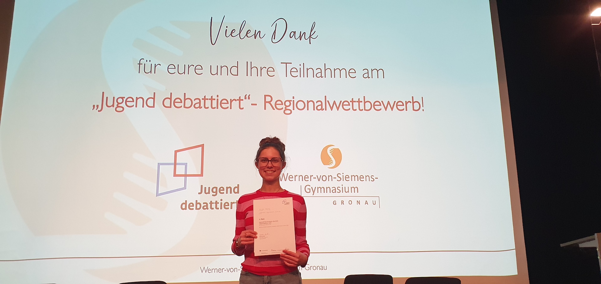 „Es macht mir Spaß, andere mit dem gesprochenen Wort zu überzeugen“. Die 15-jährige Schülerin Matilda Böwing des Städtischen Gymnasiums Ochtrup erreichte beim Finale von Jugend debattiert in der Altersgruppe I (Klasse 8-10) im Regionalverbund den zweiten Platz, der sie qualifiziert am Landeswettbewerb in Bochum teilzunehmen.