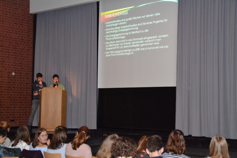 SchülerInnen der Jahrgangstufe 9 stellten ihre Projekte in der Aula vor Publikum vor. Nach dem Besuch der “Highlights der Physik – Herzrasen” im September in Dortmund, war der Physik/Chemiekurs von Frau Niederhausen hochmotiviert, eigene Projekte und Themen zu erarbeiten. Daraus ergaben sich 8 verschiedene Themen aus Medizin und Wissenschaft – von Roboterfußball, Torlinientechnik, Solaranlagen, MRT, Kernspin, Ultraschall sowie Herz- und Gehirnkrankheiten bis zur Epigenetik. Eltern, Freunde, Lehrer und Mitschüler waren hierzu herzlich eingeladen.