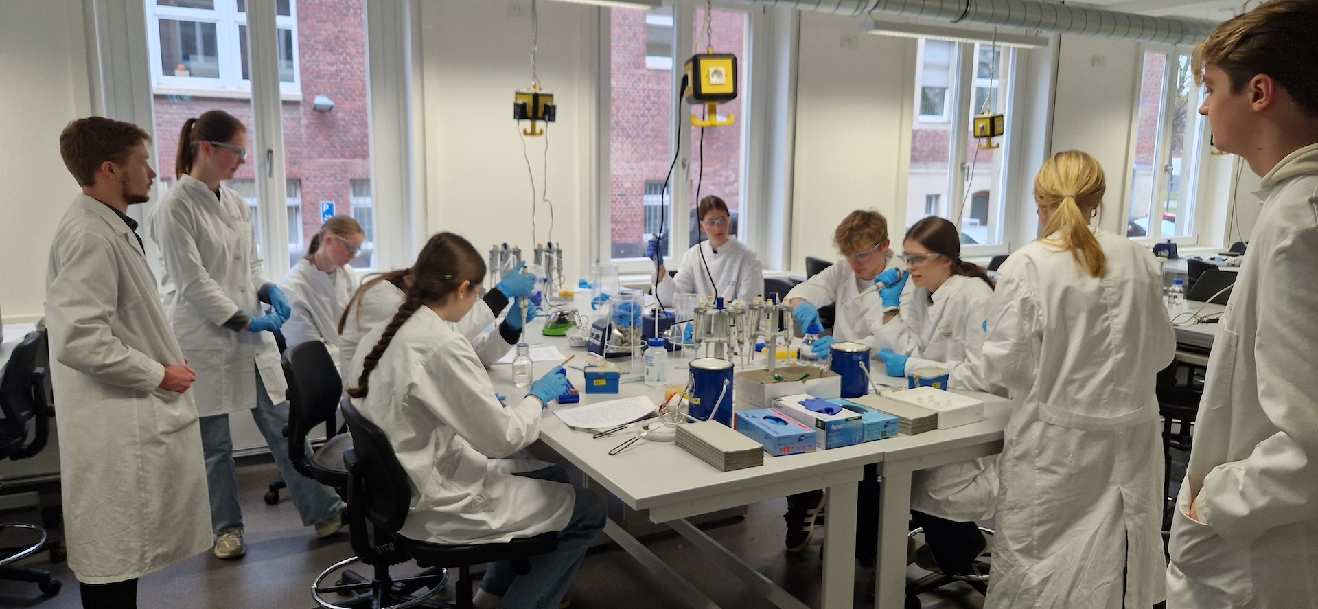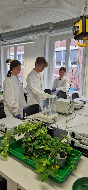 Die ehemaligen Schüler Lennard Bodenberger und Ole Luttermann haben dem Nachwuchs ihrer “alten” Schule ein neuartiges Angebot gemacht: Einen ganzen Tag lang durften die Schülerinnen und der Schüler des Bio-LKs von Frau Leineweber Experimente, Messungen und Auswertungen zur Pflanzenphysiologie machen, die sonst erst Studierenden in den Bachelorsemestern durchführen.